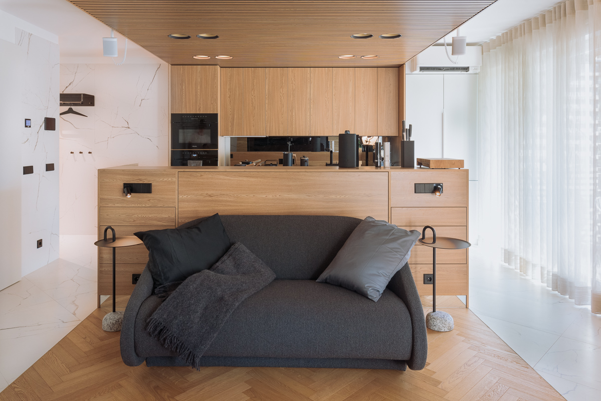 You could say the apartment has been designed down to the centimeter - from maximizing storage space in the kichen and living room cabinetry to using folding armchairs and sofa to provide sleeping space for up to 4 people, without ever giving way to an impression of design choices being compromised.